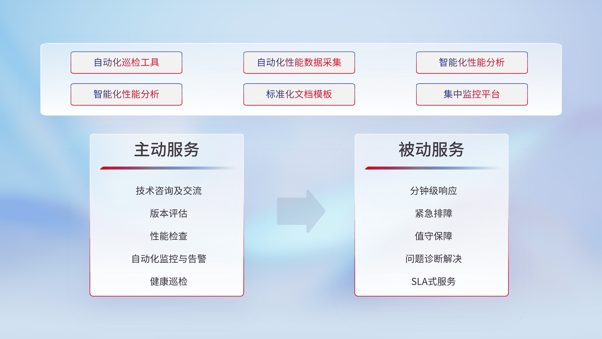 智能化工具和标准化文档,,保障服务质量,,,,提供主动服务(包含技术咨询、、、版本评估、、性能检查、、、、自动化监控与告警、、、健康巡检)和被动服务包含(分钟级响应、、紧急排障、、值守保障、、、、问题诊断解决、、SLA服务)。。。。